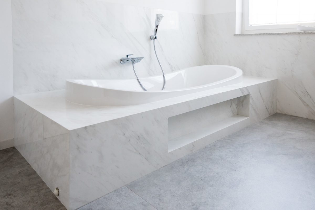 Die dünnen Feinsteinzeugplatten mit einer Materialstärke von bis zu 6mm lassen sich mithilfe von sogenannten Gehrungsschnitten zu einer optisch massiven Badewannenverkleidung verarbeiten.