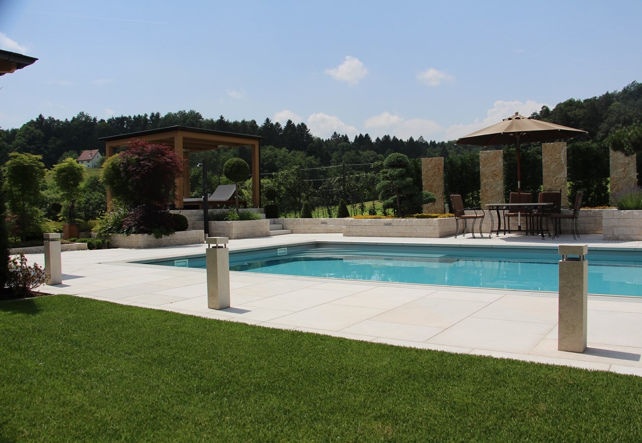 Im Gegensatz zu den Granitplatten besitzen sogenannte Kalksteine, wie Travertin oder Sandstein eine sehr samtige Oberfläche mit feinen Strukturen und einzigartigen Naturmerkmale. Warme Beigetöne sind charakteristisch für den Kalkstein und verleihen der Gartengestaltung – oftmals auch in Kombination mit Natursteinverblender – ein mediterranes Flair.