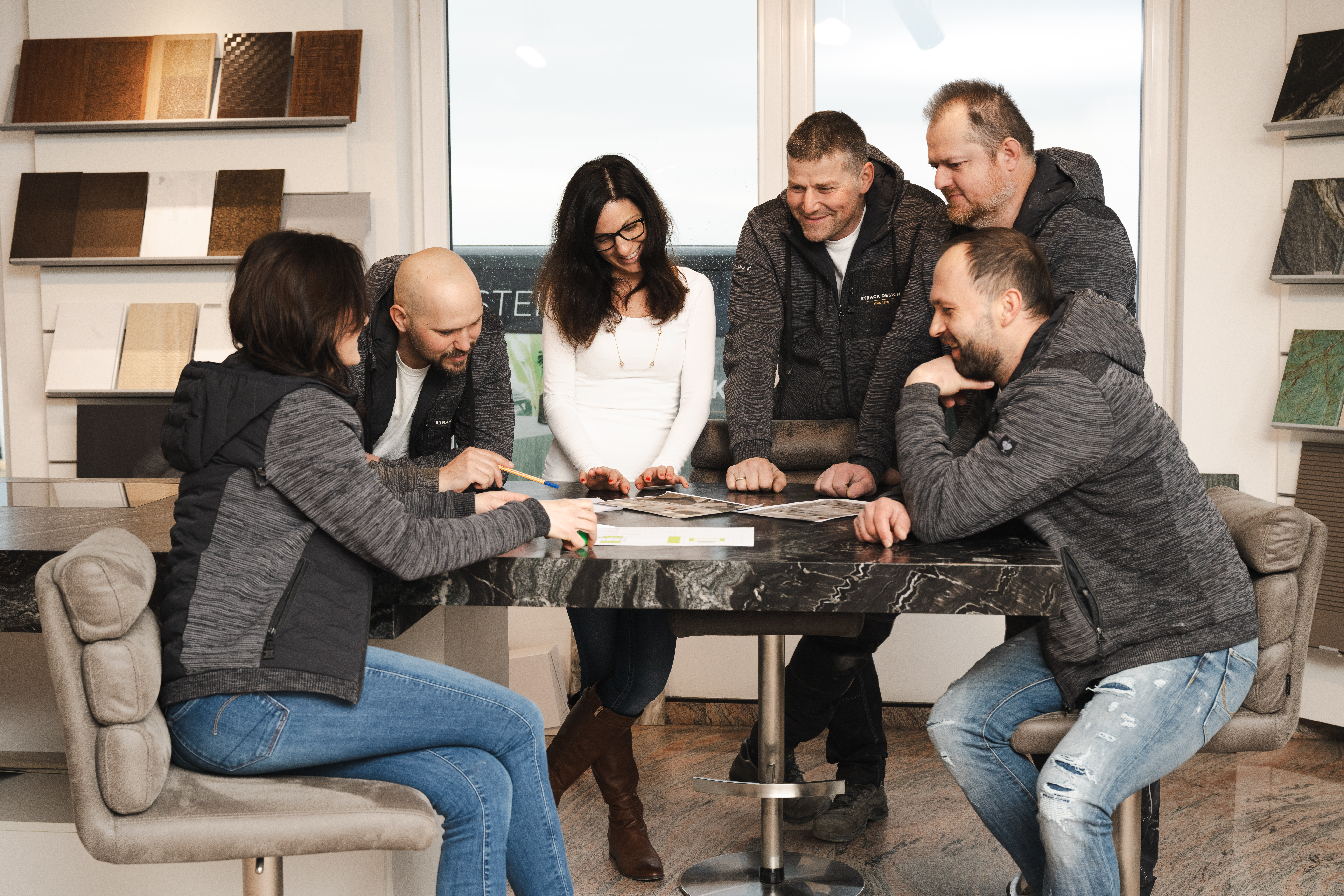 Jedes Mitglied bringt seine Erfahrung und Fachkompetenz ein, um aus Naturstein und Feinsteinzeug maßgefertigte Einzelstücke zu schaffen – präzise, langlebig und ästhetisch perfekt abgestimmt.